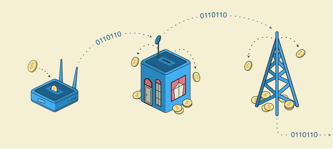 En el camino, cada enrutador (por lo general enrutadores de consumo de Linksys y de otras marcas), flasheado con el firmware Althea, es capaz de enviar de forma automática activos digitales de un lado a otro en función del uso del ancho de banda.