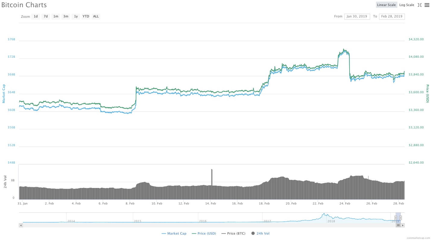 Bitcoin cierra el mes costando un 11.55% más que hace 28 días, con un rango de la fluctuación fue de $800 USD. A principios de Febrero, Bitcoin costaba $3,443.27 y a finales de Febrero, al momento de escribir el 28 de Febrero tiene un costo de $3,841. En este mes, en su punto mas alto Bitcoin costó $4,200 (23 de Febrero) y en su punto mas bajo costó $3,400 (7 de Febrero).