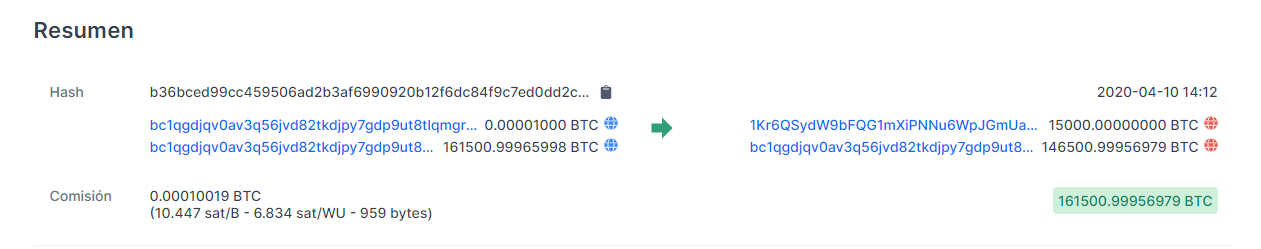 Como se puede apreciar en los detalles de la transacción, se enviaron 15 mil bitcoins a una billetera, y el cambio restante, es decir, 146 mil 500 bitcoins, fueron devueltos a la dirección original.