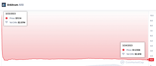 Durante las primeras horas del airdrop, el precio de ARB cayó de $11 a $1 dólar estadounidense. De hecho, al parecer solo una dirección logró vender con éxito el token a $10.29 dólares estadounidenses en Uniswap. Otras direcciones pudieron vender alrededor de $4.5, pero el precio cayó rápidamente hasta alrededor de $1 dólar.