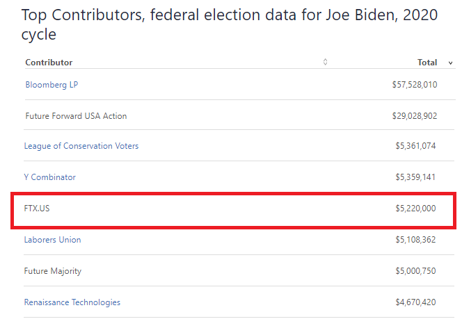 TIL That @SBF_Alameda is Joe Biden's top donor after @MikeBloomberg with a $5.2M donation to the Biden campaign. No wonder he is so interested in the election. A Biden presidency should be good for China, FTX, and his global perspective. Presented apolitically with no comment. https://t.co/AKcJrgNgJv