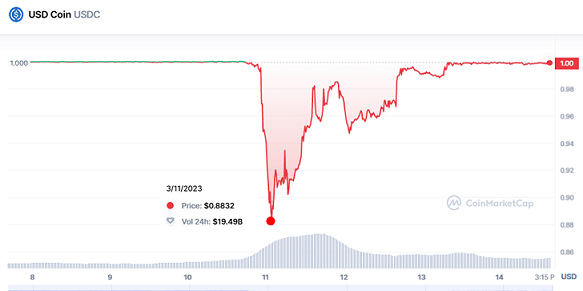 Todo esto conllevó a que USDC se desvinculara de la paridad 1:1 con el dólar estadounidense. De hecho, según CoinMarketCap, alcanzó el mínimo de $0.87 dólares estadounidenses. Muchos esperaban que USDC viviese lo mismo que Terra Luna.