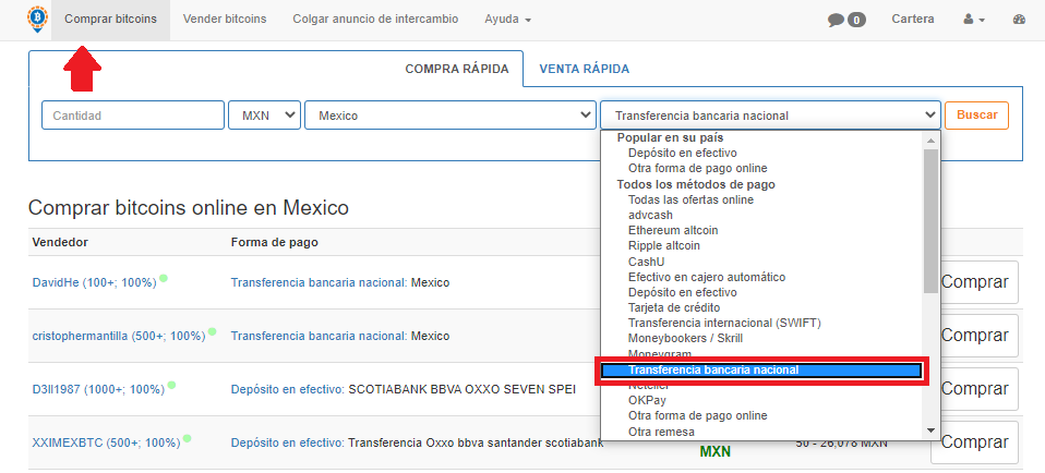 Tal como se mencionó anteriormente, LocalBitcoins tiene más de 100 formas diferentes para comprar o vender criptomonedas. Acepta transferencias bancarias, depósitos de banco, pagos por plataformas digitales como PayPal y también pagos en criptomonedas. En ese momento elegirás el método de pago deseado. En este caso iremos por la transferencia bancaria.