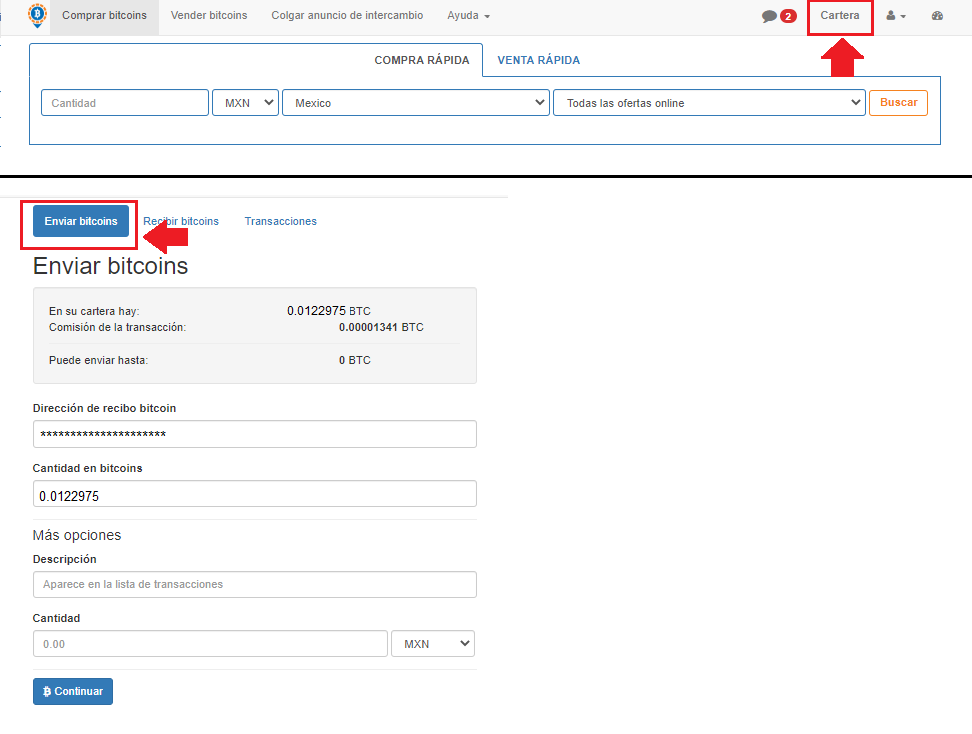 Para ingresar a tu billetera LocalBitcoins, clickea en "Cartera”, en la parte superior del portal. Ahí puedes colocar cuánto quieres mover a tu billetera. Únicamente debes agregar la dirección de Bitcoin a la que enviaras tus activos, ingresa la cantidad y da clic en "Enviar bitcoins". Revisa que la dirección sea la correcta.