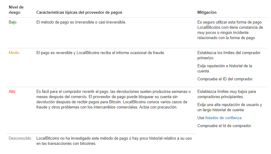 El primero, y que ya mencionamos anteriormente, es que debes tomar en cuenta algunas características de los métodos de pago, ya que algunas garantizar mayor seguridad que otras. Al respecto LocalBitcoins advierte que hay métodos de pago considerados de alto riesgo ya que tienen un nivel significativo de fraude, para no caer en algún tipo de estafa verifica la identidad de la persona con la que hará el trato si desea optar por un método de pago de alto riesgo.