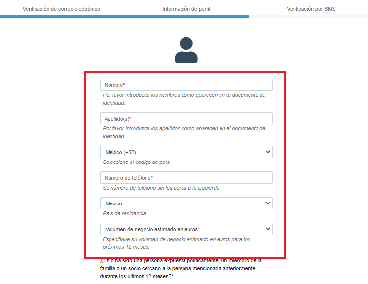 Nivel de verificación T1: Los usuarios pueden comprar/vender hasta 20,000 euros al año, cifra que en pesos mexicanos es cercana a los 485,000. A este nivel se accede llenando una solicitud en la que entregaremos información como domicilio, entre otras.