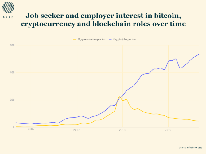 Por su parte Forbes, indica que hubo un aumento de 600 % en la demanda para estos trabajos en los sitios tradicionales de búsqueda de empleo en los Estados Unidos. Ejemplo de esto, es la actividad de un sitio especializado como CryptocurrencyJobs.com, donde solo hay anuncios sobre este tópico.