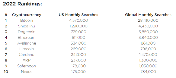 Shiba Inu ocupa el segundo lugar en Estados Unidos con alrededor de 1,290,000 búsquedas mensuales, pero en términos de búsquedas mensuales globales, se ha posicionado en tercer lugar con más de 4.4 millones de búsquedas. Esta criptomoneda meme fue superada a nivel global por Dogecoin con un promedio de 5, 850, 000 búsquedas en todo el mundo durante el año, sin embargo en EUA se ha posicionado en el tercer lugar detrás de SHIB con alrededor de 729,000 mensuales.