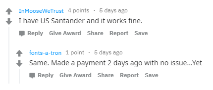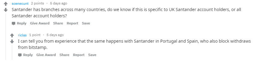 El usuario de Reddit, mencionó que después de haber sido alertado por teléfono sobre la exclusión de la moneda virtual en el banco, presentó una reclamación en la unidad de reclamaciones de Santander, la cual al parecer le confirmó al cliente que si deseaba realizar un movimiento bancario a dicha plataforma, era necesario que se trasladara a un banco alternativo.