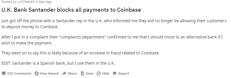 A través de Reddit, usuarios dieron a conocer que el banco español Santander, bloqueo a clientes de Reino Unido para que no puedan depositar sus fondos fiduciarios en el principal intercambio de criptomonedas Coinbase.