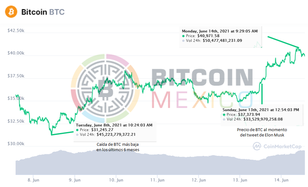 El martes de la semana pasada Bitcoin tocó su piso más bajo desde que empezó su carrera alcista en enero, no obstante, este fin de semana la moneda virtual nuevamente ha comenzado a subir de precio, después de que el magnate dueño de Tesla, Elon Musk escribiera un tuit con mención al BTC.