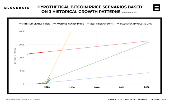Para llegar al volumen que maneja Mastecard, BTC tendría que crecer un 240%. Sin embargo, mirando la adopción de cada uno en estos momentos, ese objetivo no parece ser tan ambicioso para los próximos cinco años.