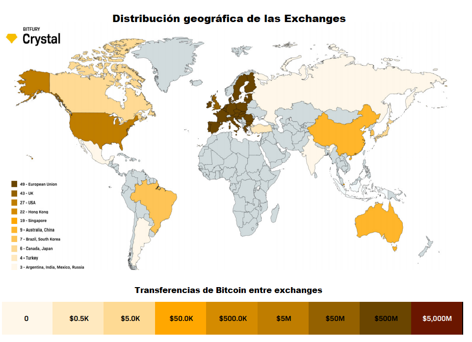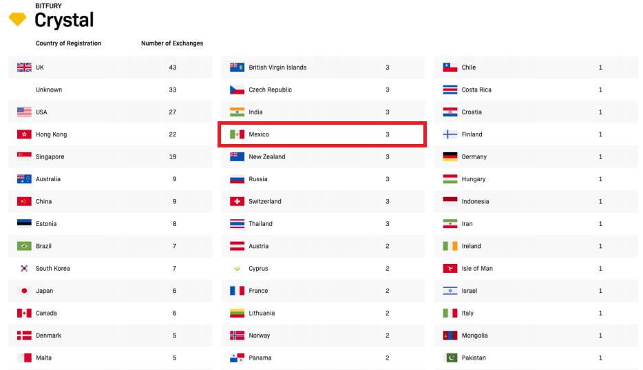 De acuerdo Bitfury Crystal, un promedio del 10 por ciento de todas las casas de cambio que fueron consideradas para la elaboración del informe, no cuentan con países de registro.
