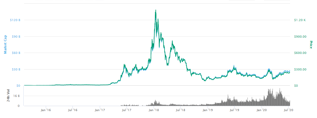 Si bien Ethereum se encuentra muy lejos de su tope histórico de $ 1,448 dólares la unidad, su estabilidad cercana a los $ 250 dólares significa un crecimiento en el último tiempo. Su piso anual fue en marzo, con 107 dólares, y el precio que hoy registra es similar al que tuvo hace un mes y medio. En comparación a hace 12 meses, el valor estaba en 289 (-14%)