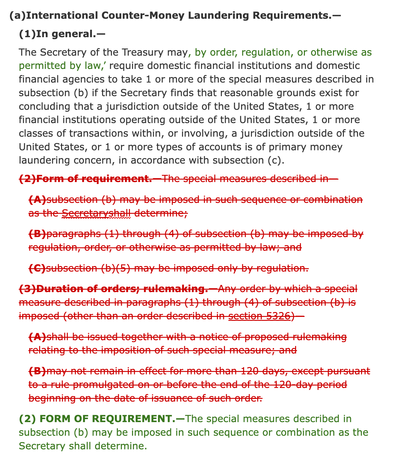 Actualmente el secretario ya cuenta con la habilidad de cerrar cualquier cuenta que considere que representa un posible peligro debido a sus vínculos o relaciones con el lavado de dinero, ya sea por parte de un solo sujeto o de una organización ubicada fuera de Estados Unidos. Para hacer efectivo este proceso la ley le exige al secretario realizar ciertos señalamientos el cual incluye que el afectado debe ser notificado, además de brindarle la posibilidad de defenderse. Esta prohibición no deberá sobrepasar los 120 días.