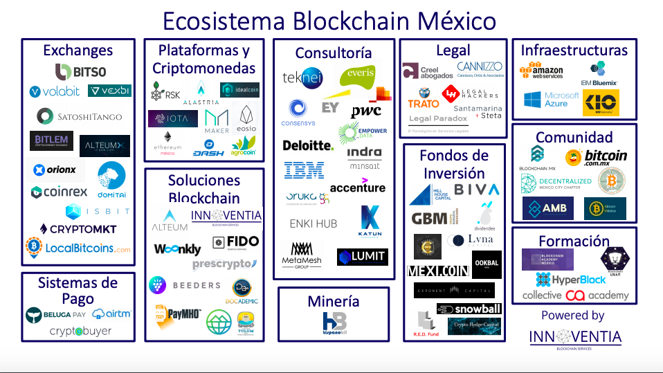 Además Innoventia ha hecho el primer estudio del ecosistema de Blockchain en México para detectar a las empresas que trabajan esta tecnología. Registraron a Exchanges, Criptomonedas, sistemas de pago, despachos legales, fondos de inversión y otros proyectos que dan vida a la tecnología en México.