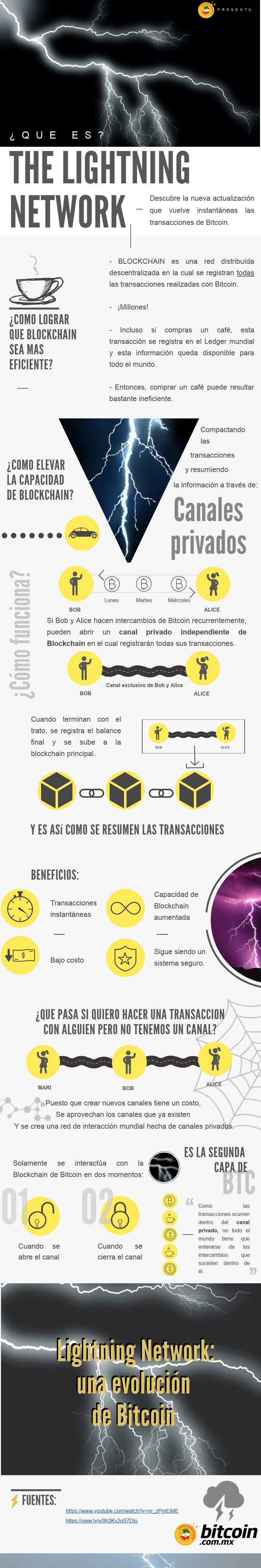 The Lightning Network es una tecnología que revoluciona las transacciones de Bitcoin porque las vuelve aún más eficientes. Este sistema ofrece la posibilidad de realizar transacciones independientes de la Blockchain principal a través de canales privados. Cuando una serie de transacciones termina, se actualiza el balance final de los involucrados en la Blockchain principal. De esta manera, no se tendrán que registrar todas y cada una de las millones de interacciones que ocurren en el mundo. En este infográfico realizado por Bitcoin México te explicamos de manera fácil y sencilla cómo funciona este sistema.