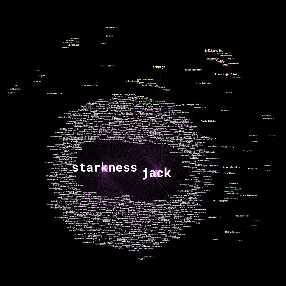 Este es un mapa del recorrido que ha hecho el Hasthag #BitcoinTwitter. Se pueden ver todos los usuarios que han hecho un re-tweet de este hashtag. Con este mapa, se vuelve evidente que hay dos usuarios que han iniciado este hasthag viral y que ha sido re-utilizado por muchos otros usuarios, que en la mayoría de los casos retoman este tweet de publicaciones que Jack o Starkness han hecho.