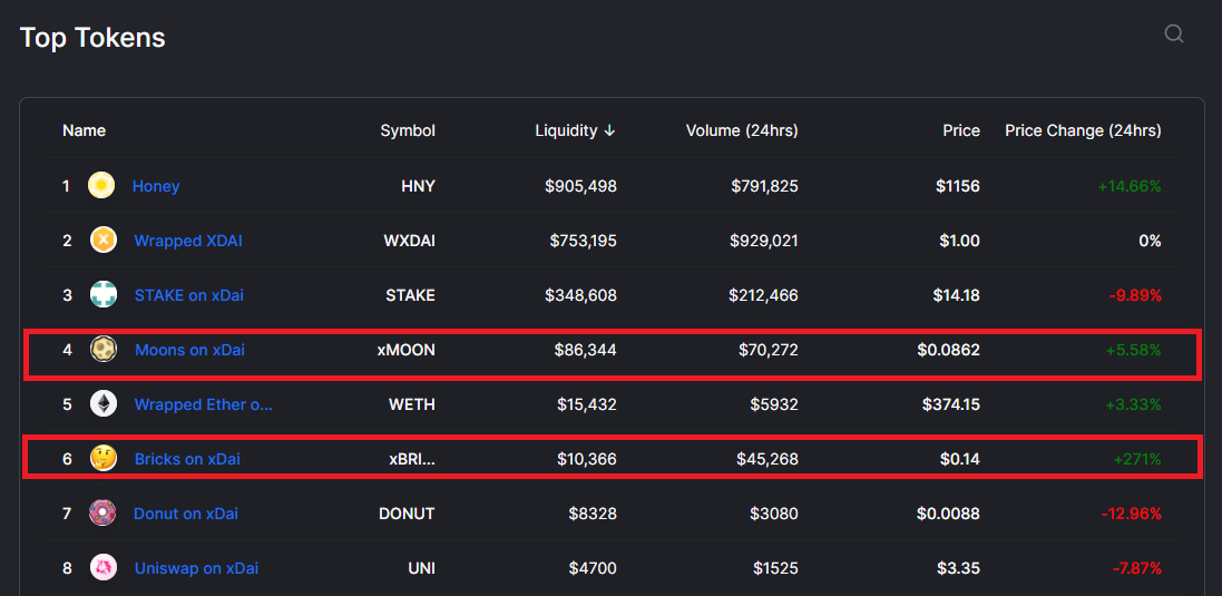 No obstante, todavía es factible el hecho de comercializar los activos digitales Bricks, por medio de una nueva casa de cambio descentralizada construida de forma nativa en la red xDai, Honeyswap. En esta exchange los tokens cuentan con un valor real, aunque este es relativamente bajo, dado que un solo Brick tiene un valor de aproximadamente $0.03 dólares, además de que una transacción tiene un precio de aproximadamente $ 8.89 dólares.