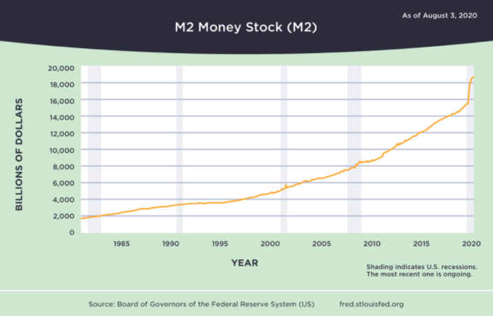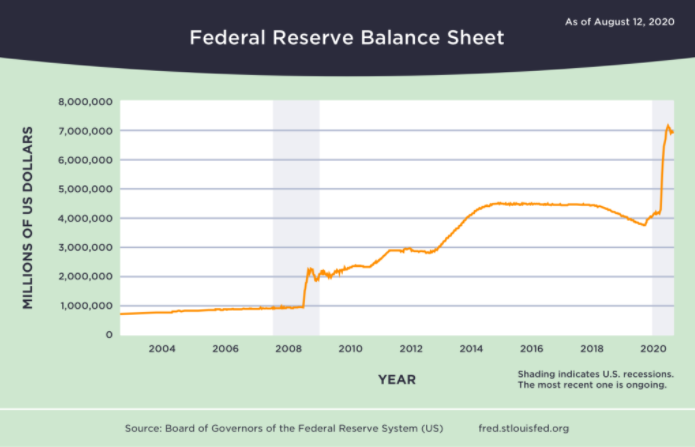 Con la llegada de la pandemia, el gobierno de los Estados Unidos continuó con el aumento de la oferta de dólares estadounidenses en circulación en 3 billones. Lo hizo a través de valores respaldados por hipotecas y bonos del Tesoro a largo plazo. Además, 1.1 de esos 3 mil millones fue dinero impreso. En los últimos seis meses, la Reserva Federal imprimió dos tercios de la cantidad de dinero que se había impreso en los anteriores 11 años.